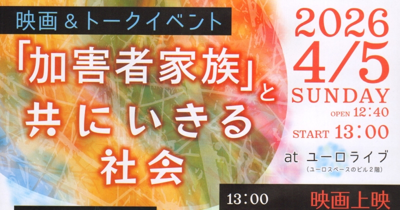 4月5日 東京都渋谷区のユーロライブで「『加害者家族』と共にいきる社会」と題する映画&トークイベントを開催します。